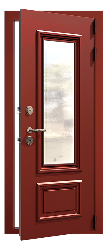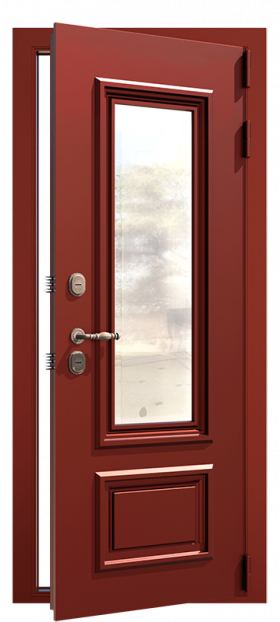 Трехкамерный бронированный стеклопакет, класса А3, 72 мм с тремя воздушными карманами и четырьмя стеклами ударопрочен, изолирует звуки и препятствует теплоотдаче. Светлый стеклопакет обеспечивает широкий обзор пространства за дверью и светопропускную способность. Классическая решетка в стеклопакете завершает стилистическую композицию данной модели. Оригинальным обрамлением входной двери послужит металлический карниз ручной работы, который придаст двери изысканный вид. Монтаж карниза предусмотрен при помощи стяжных болтов в наличник.